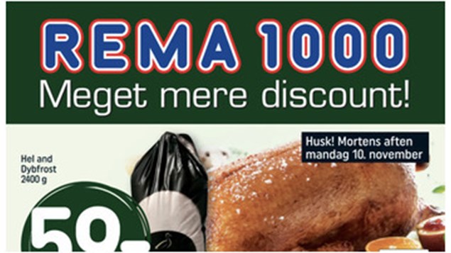 Hos Rema 1000 kan du få en dybfrossen hel and på 2400 g for kun 59 kr. Det svarer til en kilopris på 24,58 kr. Dette tilbud gælder fra søndag den 26. oktober til lørdag den 1. november.